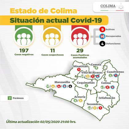 Colima es la entidad federativa en México con la menor cantidad de casos confirmados y defunciones por COVID-19. Hasta este sábado, de los 29 casos positivos registrados, 16 se han recuperado, nueve siguen activos, y cuatro han fallecido.